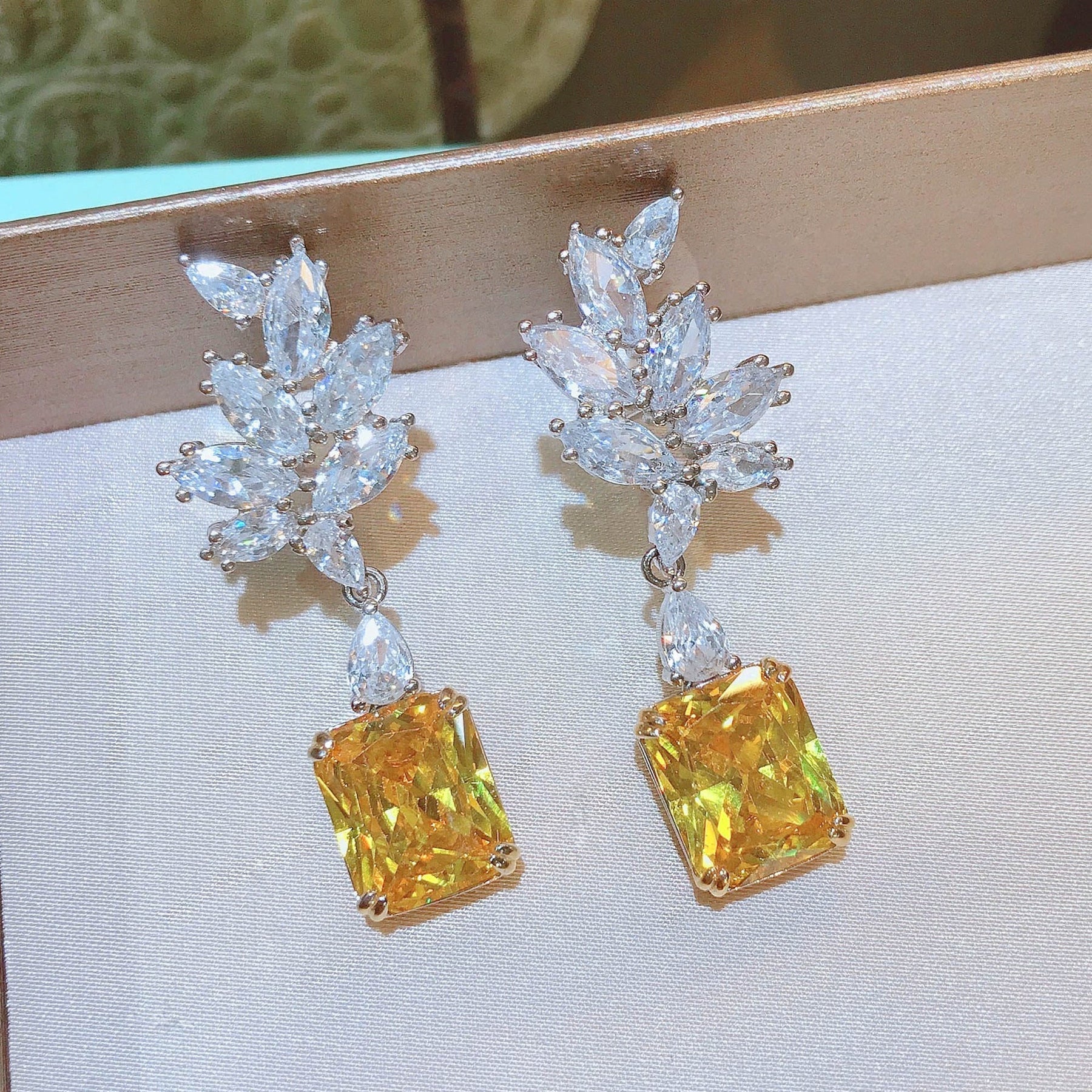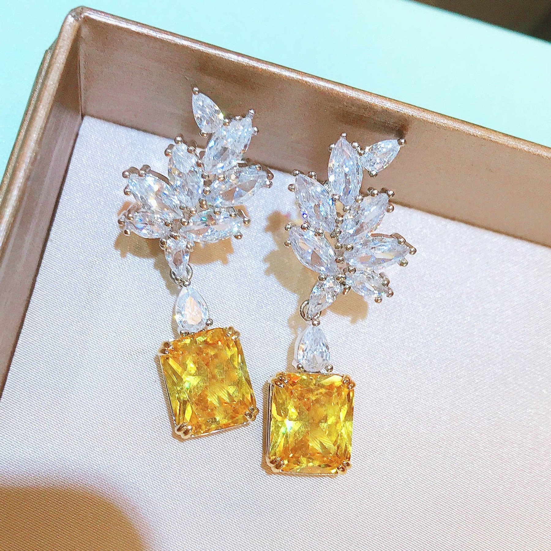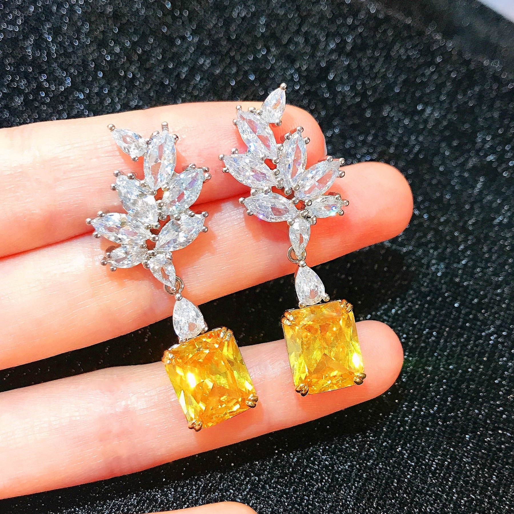De oorbellen zijn samengesteld met vele zirkonia's van AAA kwaliteit. Het bovenste speelse gedeelte is gemaakt met 9 witte zirkononia's met daaronder een grote oker kleurige steen, welke briljant geslepen is.